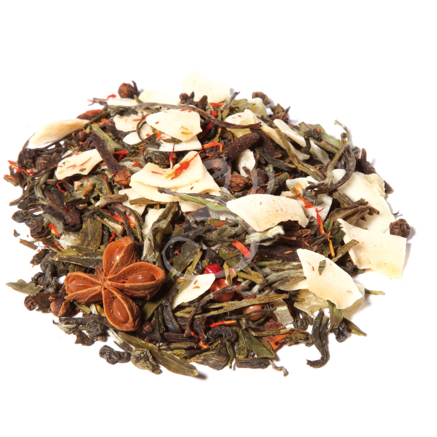 Složení: zelený čaj China Sencha, Bílý čaj Pai Mu Tan, kokos (kokos, kokosový olej, cukr), Green Tea Gunpowder, Green Tea China Jasmin, zázvor, pomerančová kůra (5 %), přírodní pomerančové aroma, růžový pepř, badyán, hřebíček, zelený čaj China Lung Ching, zelený čaj Darjeeling OP, okvětní lístky světlice, kardamon.