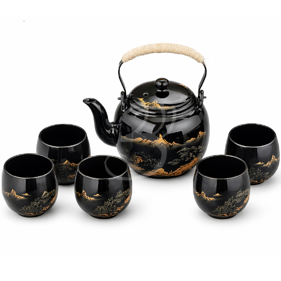Stylová japonská čajová souprava v elegantním černém provedení s dekorativním motivem krajiny. Díky harmonickému tvaru a výraznému lesku působí souprava luxusně a skvěle doplní jak moderní, tak tradiční interiér. Hodí se pro každodenní podávání čaje i pro slavnostnější chvíle.
