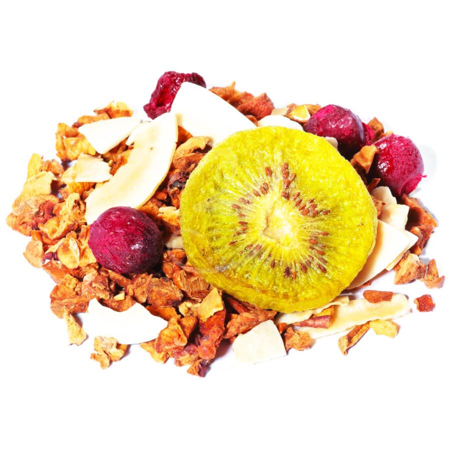 Složení čaje: jablko, kokos (kokosový ořech, kokosový olej, cukr), příchuť, plátky kiwi, višně, brusinky