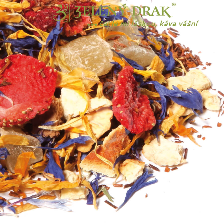 Složení čaje: rooibos Super Grade (min.70%), ananas (ananas, cukr), přírodní aroma jahody a mirabelky, pomerančová kůra, lístky žlutého měsíčku, jahoda, modré květy chrpy.