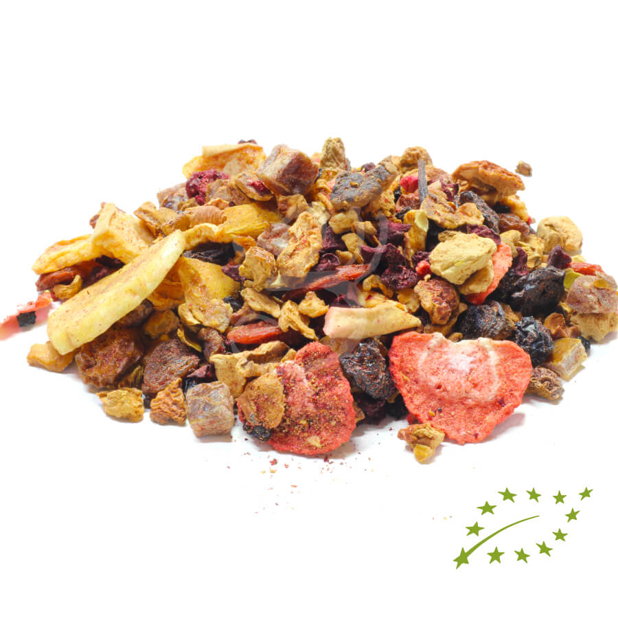 Složení čaje: kousky jablek*, datle (datle, rýžová mouka)*, červená řepa*, fíky (fíky, rýžová mouka) *, hroznové víno (hrozny, rostlinný olej)*, banán (banán, kokosový olej, třtinový cukr, med)*, bezinky*, Aronie*, višně*, mango*, goji berry*, jablečné čtvrtky*, physalis*, jahody*, maliny*, ostružiny*. * označené přísady pochází zkontrolovaného ekologického zemědělství .