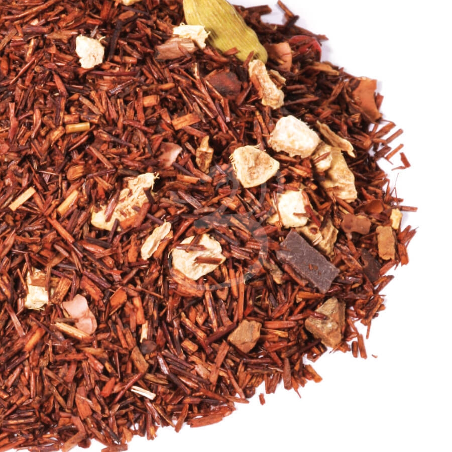 Složení: Rooibos Super Grade, černý pepř, kakaové slupky, kousky skořice, zázvor, příchuť, čokoláda (cukr, kakao, kakaové máslo, sójový lecitin (4%) (přírodní antioxidant)), kardamon.